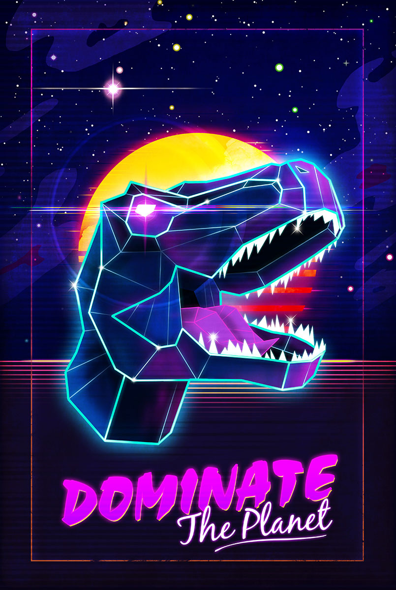 The 1980’s inspired electric neon Outrun artwork continues! What better than a T-Rex, glowing in all of it’s Jurassic glory?
